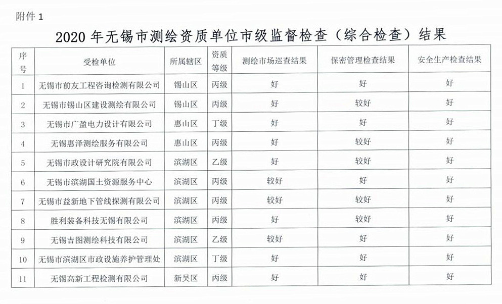 | 2020年無錫市測(cè)繪資質(zhì)單位市級(jí)監(jiān)督檢査結(jié)果出爐 | ||
