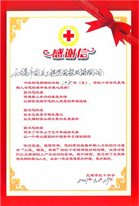 為進一步踐行社會主義核心價值觀,大力弘揚“人道、博愛、奉獻”的紅十字精神,倡導“互助、環(huán)保、節(jié)能、公益”的社會理念,根據(jù)市委市級機關工委、市文明辦、市紅十字會《紅十字愛心衣物捐贈倡議書》精神,我公司積極組織,大家踴躍捐出款式新、質量好的衣物并主動利用節(jié)假日期間對所捐衣物進行清洗、晾曬、消毒,確保捐贈的愛心衣物符合要求,并于2021年1月29日下午將所捐衣物送至無錫市紅十字會。