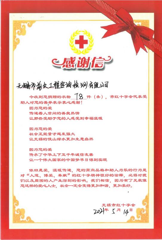 2021年是我們偉大的中國共產(chǎn)黨建黨100周年,在慶祝黨百年華誕的重大時刻,在“兩個一百年”奮斗目標(biāo)歷史交匯的關(guān)鍵節(jié)點,無錫市前友工程咨詢檢測有限公司再次組織愛心衣物捐贈活動,以實際行動獻禮建黨100周年。 此次衣物捐贈受益對象為本市低收入家庭、殘疾人家庭、外來務(wù)工人員、遭遇突發(fā)事件陷入困境的家庭、對外援助貧困和受災(zāi)地區(qū),因此,本次活動得到了公司員工的積極響應(yīng)和大力支持。廣大員工積極踴躍參加,整理家中閑置衣物。此次共收到員工捐贈的衣物90余件,從中選擇出符合捐贈要求的衣物78件,整理打包后已于5月14日送至市紅十字會統(tǒng)一捐贈。前友的發(fā)展得益于改革開放的偉大時代,前友人有一顆感恩的心。 本次愛心衣物捐贈活動,激發(fā)了公司員工參與公益事業(yè)、傳遞愛心的熱情,折射出了前友人身上所具有的助人為樂、無私奉獻的良好品格,彰顯了公司的社會責(zé)任感。讓我們繼續(xù)為愛助力,為實現(xiàn)中華民族兩個一百年的宏偉目標(biāo)努力工作,付出自己的微薄之力。