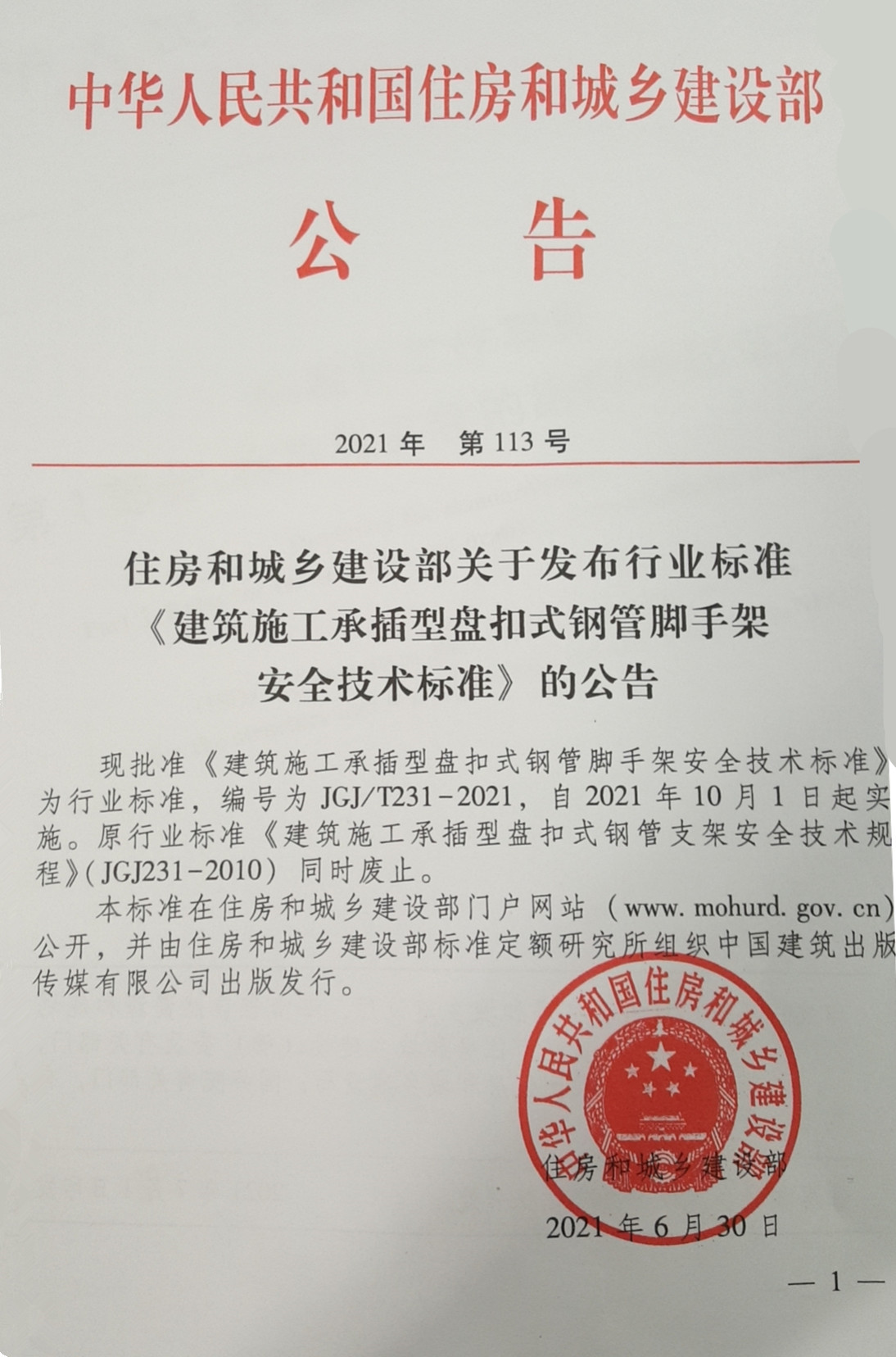 | 公司參編的《建筑施工承插型盤扣式鋼管腳手架安全技術標準》已獲批 | ||