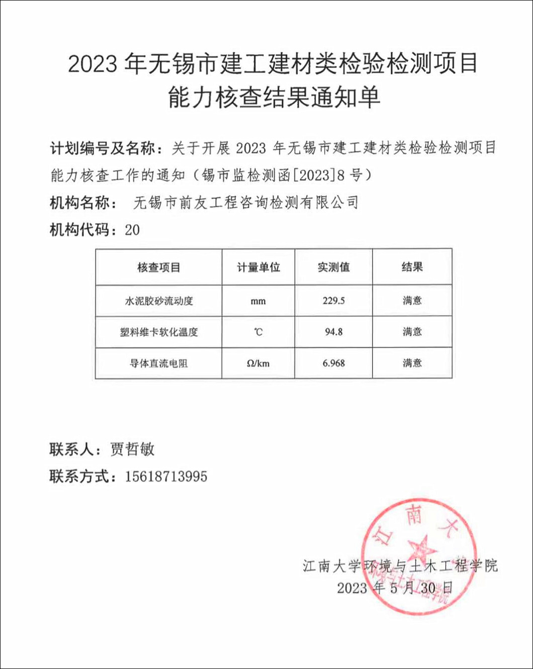 為加強對我市資質(zhì)認定檢驗檢測機構(gòu)的事中事后監(jiān)管,提升檢驗檢測機構(gòu)技術(shù)能力水平,根據(jù)《檢驗檢測機構(gòu)監(jiān)督管理辦法》第十八條并結(jié)合我市實際,無錫市市場監(jiān)督管理局于5月份在全市資質(zhì)認定檢驗檢測機構(gòu)中開展水泥膠砂流動度、塑料維卡軟化溫度、電線電纜導體直流電阻等參數(shù)的檢測能力核查工作。 本次能力核查工作委托江南大學為技術(shù)支持單位,負責能力核查作業(yè)指導書制定、樣品準備、結(jié)果匯總、統(tǒng)計分析等工作。 水泥膠砂流動度、塑料維卡軟化溫度參數(shù)測定結(jié)果采用Z比分數(shù)進行判定。|Z|≤2,判定為滿意值,說明機構(gòu)目前的檢測能力狀況良好;2<|Z|<3,判定為可疑值,說明機構(gòu)目前的檢測能力狀況存在一定問題;|Z|≥3,判定為不滿意值或離群值,說明機構(gòu)目前的檢測能力狀況不理想,存在較大問題。電線電纜導體直流電阻按照與標準物質(zhì)證書指定值進行比對,在證書規(guī)定的允許誤差范圍內(nèi)為滿意結(jié)果,不在證書規(guī)定的允許誤差范圍內(nèi)為不滿意結(jié)果。本次能力核查中,無錫市前友工程咨詢檢測有限公司獲得滿意結(jié)果。